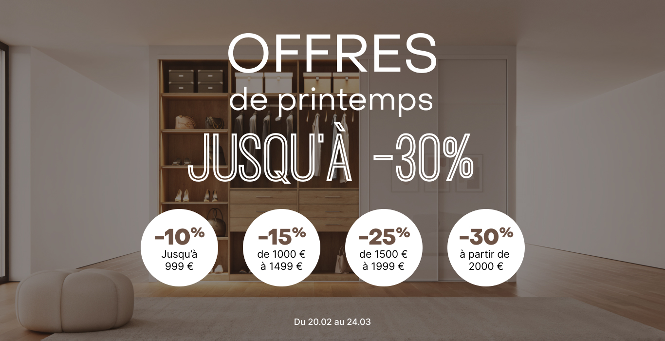 * Produits meuble sur mesure : Dressing, Armoire, Meuble TV et Bibliothèque, Portes de placard coulissantes, Portes de placard pliantes, Placard, Verrière : -10% jusqu'à 999€ d'achat, -15% entre 1000 et 1499€ d'achat, -25% entre 1500€ et 1999€ d'achat, et -30% au delà de 2000€ d'achat (hors Bonnes affaires) Offre non cumulable avec une autre offre commerciale en cours.